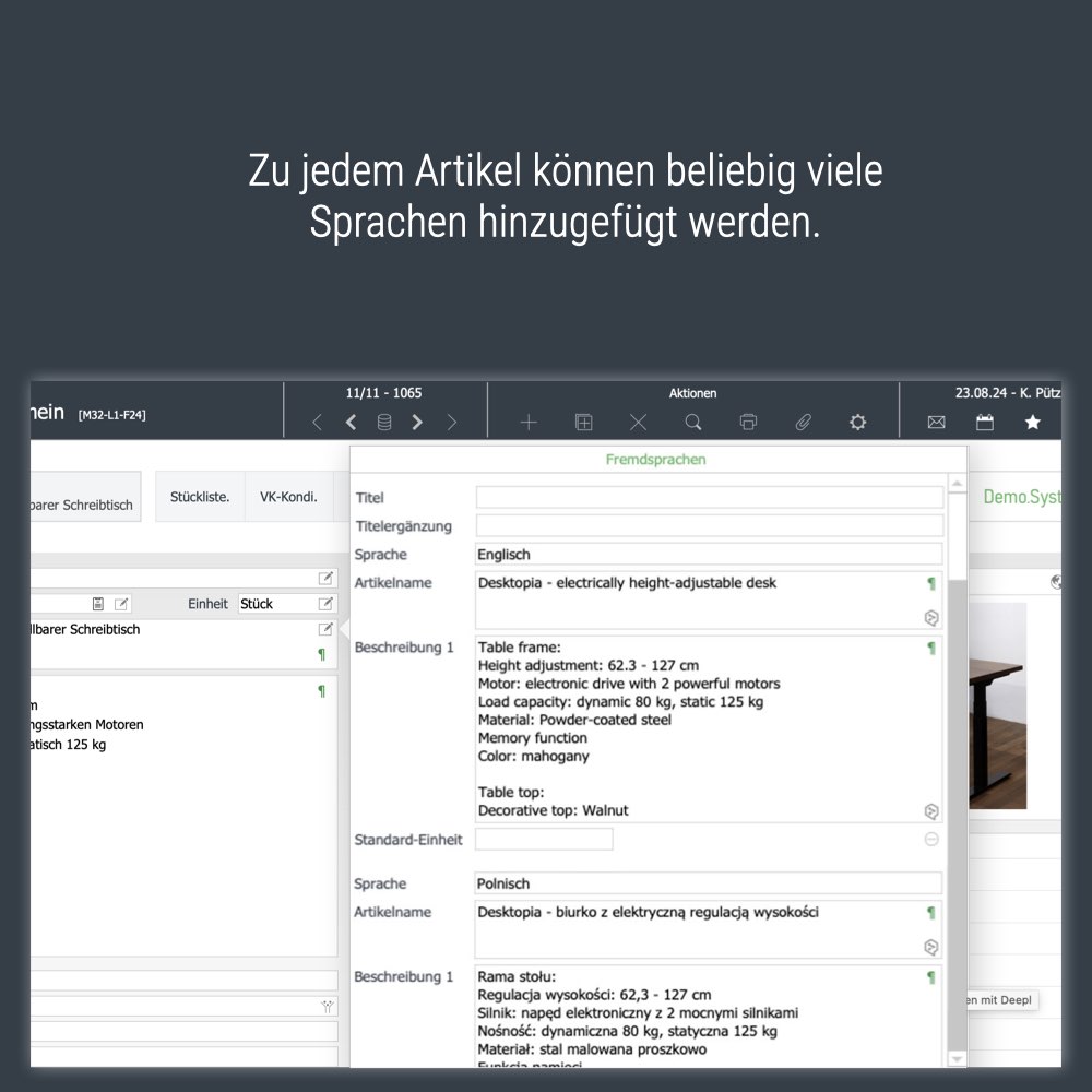 Direkt aus dem System heraus über die Artikeldetailseite können Sie die Übersetzungen in mehreren Sprachen ergänzen.